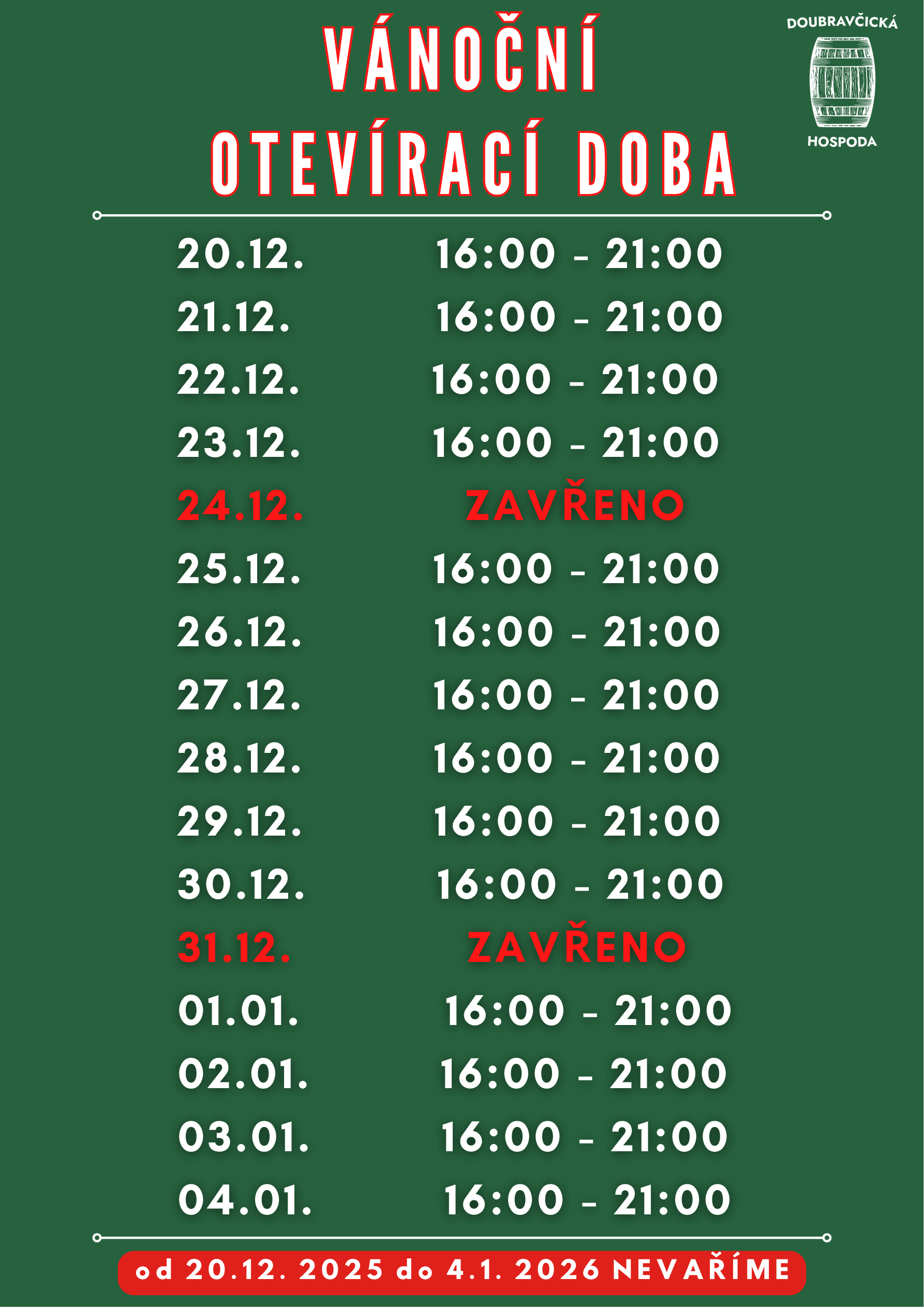 0d 20.12.2025 do 4.1.2026 jsou zrušeny polední obědy.